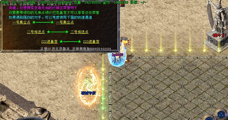 【沙城系统】 攻沙结束后,沙老大在皇宫自动领取奖励,首次沙奖励为44444万元宝+一件超级装备.