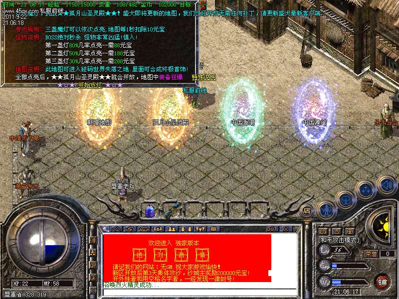 <255,220>提示:本服务器高级怪物30分钟刷新,终极怪物60分钟刷新,终极首饰、武器、衣服都能暴出、去神秘的狐月山慢慢探索吧!