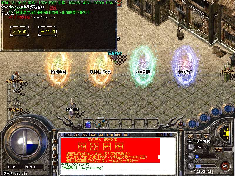 <255,220>〖公告〗欢迎进入本传奇,我们力争保证:公平,公证,公开,认真对待每一个玩家。本游戏不设管理员,不卖装备,不调级,只出售元宝,为广大的玩家创造一个自己当家做主的传奇人的天堂!