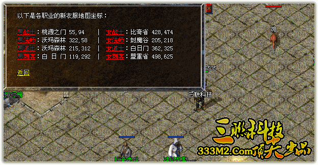 【八件新衣服】各职业的新衣服地图坐标:(男战士:桃源之门55,94)、(女战士:比奇省428,474)、(男法师:沃玛森林322,58)、(女法师:封魔谷205,218)、(男道士:沃玛森林215,312)、(女道士:白日门362,325)