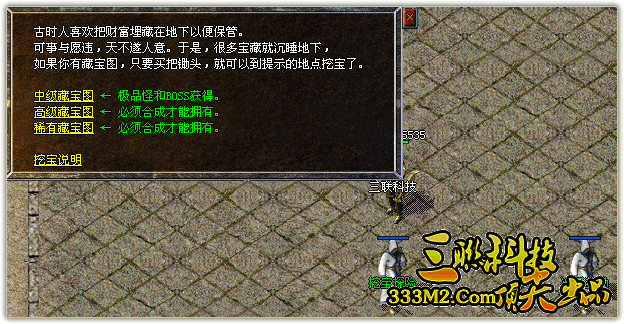 【藏宝图】玩家打到藏宝图千万别丢,普通宝藏图可合成高等藏宝图,双击藏宝图可以挖取丰厚的宝藏,让你一夜暴富,更有终极装备等着你呢!