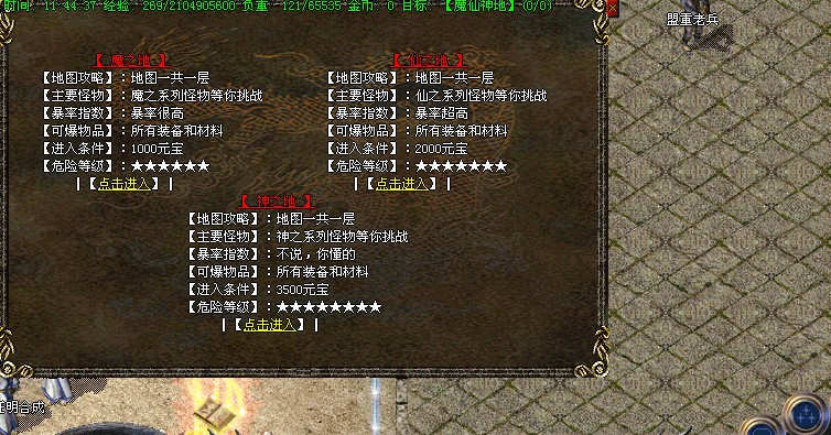 【地图介绍】:练级地图为疯狂练级、恶魔广场,石墓、生死之间、幻境三层、霸者大厅、尸魔三层.特别自助刷怪地图恶魔广场为5倍经验*三倍经验石可实现15倍经验
