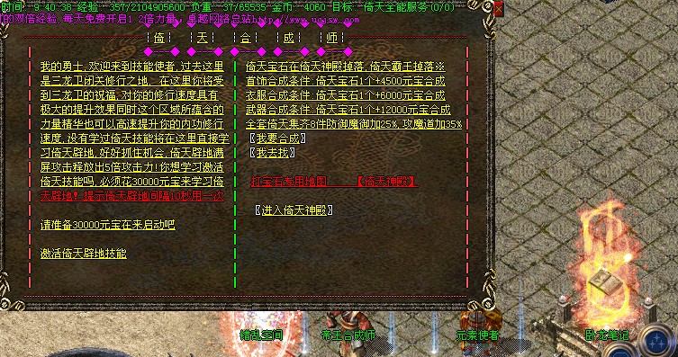 全新技能闪亮登场倚天辟地技能满屏5倍攻击可以在元宝商铺花30000万元宝购买。