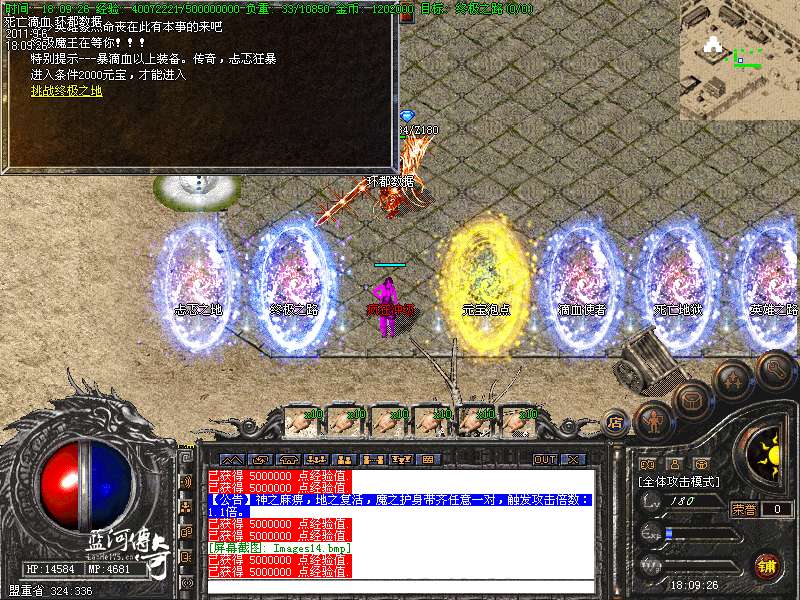 必杀套:6件死亡滴血首饰触发 防 + 200 必杀衣服+武器 1.5 倍攻击 HP+4000 MP+4000 防+400