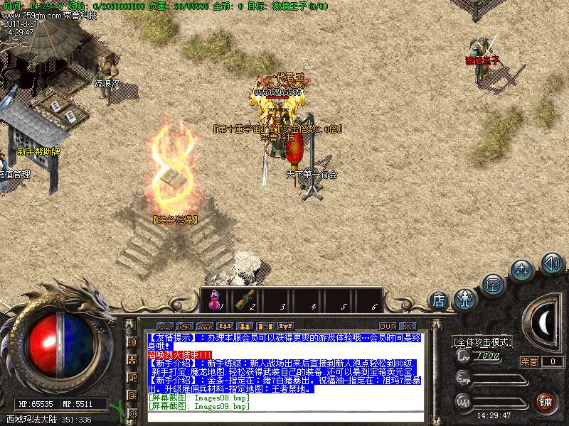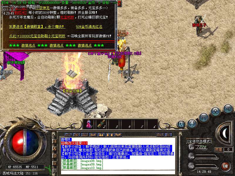【新手介绍】:新手练级:新人战场出来后直接到新人泡点轻松到80级. 新手打宝:魔龙地图.轻松获得武装自己的装备.还可以暴到宝箱卖元宝.