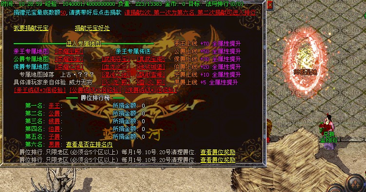 【爵位专属】亲王.+70全属性提升.公爵+50全属性提升.侯爵.30属性提升.专属地图 掉落上古神器 上古神铠 刷有大量BOSS.详情查看NPC.爵位排行.