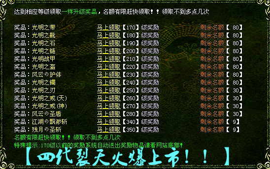 4.本F不出售任何装备一切游戏内暴出以及光明.九天.江湖.风云.等装备非常好爆。