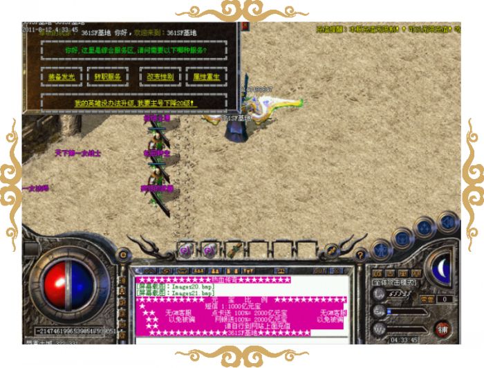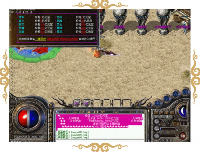 元宝比例:短信1:1000亿元宝★点卡送100%=2000亿元宝★网银送100%=2000元宝 请自行到网站上面充值。无任何待遇,非诚勿扰!!!