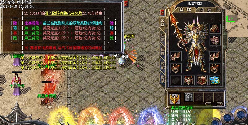 奥运赛跑说明:每天晚上22点开始举行,全服玩家都可以参加,跑在前三名领取奖励的获胜,途中有怪,更有超多障碍。