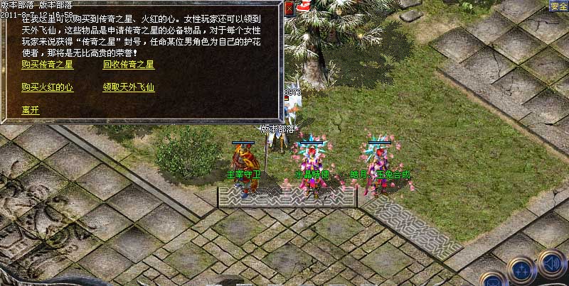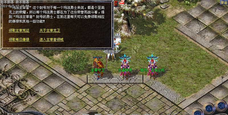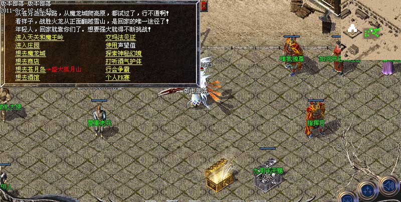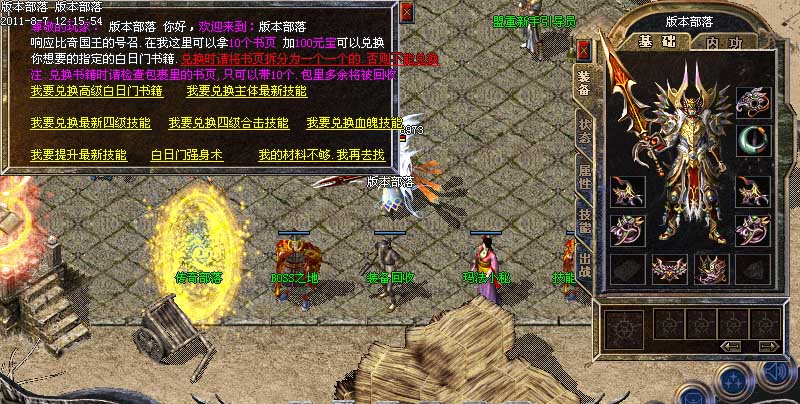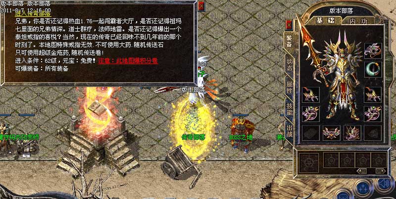 欢迎来到版本部落,本服为最新100%仿盛大玛法通鉴版本(挖宝、鉴宝),增加盛大所有最新技能,最新传奇套装,如果在游戏中有任何疑问,请点击盟重玛法小秘查询游戏攻略!玩家特别注意,请勿在游戏中使用任何加速吃血变态外挂,管理会不定期检查后台,发现使用恶意外挂者一律删号处理!谢谢所有玩家配合!