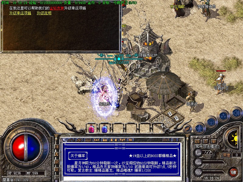 关于爆率1W血以上的BOSS都爆精品星月神殿为60分钟刷新一次,沙宝阁怪物60分钟刷新,精品新衣服爆率为1/40,精品赤月首饰爆率为1/10 武器最高可升级7点,5秒钟可取。复古教主:爆精品屠龙、精品嗜魂!爆率1/200