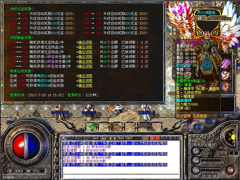 150级以上升级就送元宝,等级越高送的元宝就越多,详细说明在土城传送右上一点点的领奖使者处查看,如何快速升级: