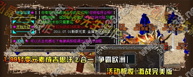 【版本信息】:欢迎大家进入2011年07月最新火爆1.99轻变元素成吉思汗、争霸欧洲、活动靓妆、激战完美版, 功能最多 地图最多 美妙滋味 需玩家慢慢品味。。
