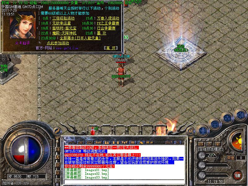 [每日活动]:服务器每天的0点(三倍经验)、15点(万兽入侵)、18点(无敌幸运星)、18点30分(PK之王争霸赛)、19点(摇钱树摇金元宝)、19点30分(行会争霸赛)、22点(魔殿-天降神机)、23点(墨攻-全区的人围攻终极BOOS)等活动,更多信息请点击土城中央的-[活动NPC]了解,建议千万别错过...