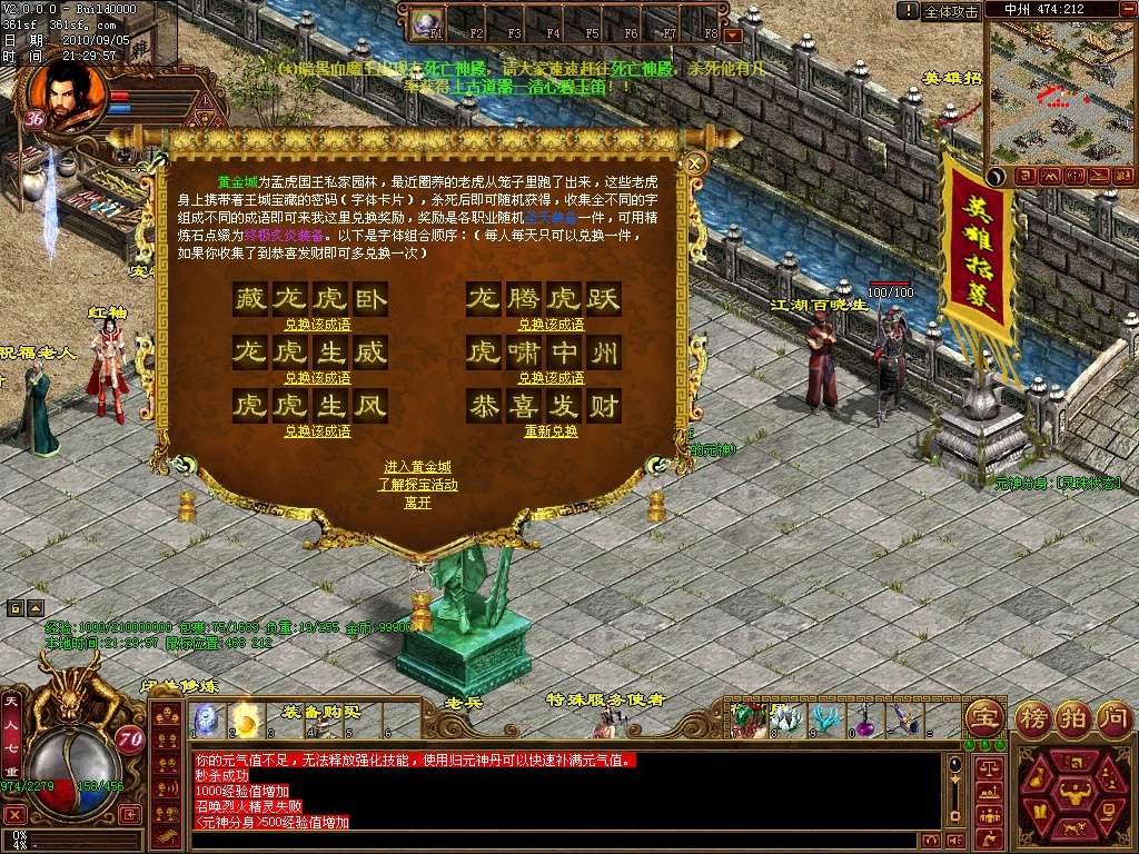 黄金寻宝:活动开始进入黄金城地图,杀死携带字体的老虎收集字体,即可兑换圣天装备
