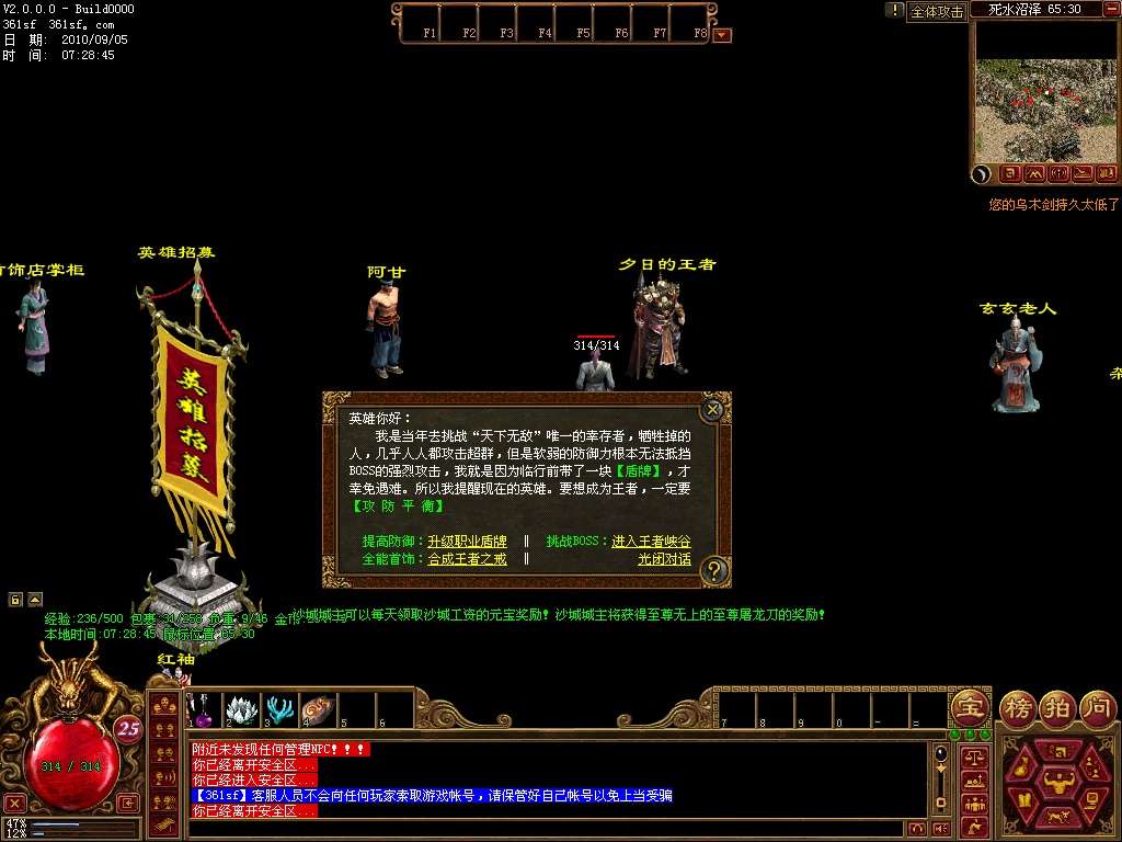 全新升级的游戏版本推出大型免费地图<王者征程>在死水NPC进入,可获得职业盾牌,及王者之戒!