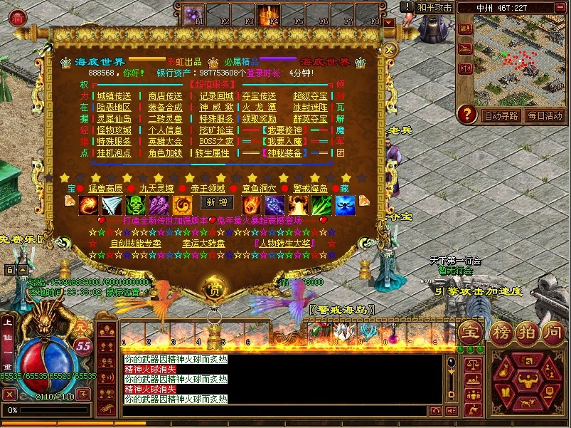 游戏助手:海底世界爆武神级装备比顶级低一成的装备 6个BOOS必爆一样还有元宝`