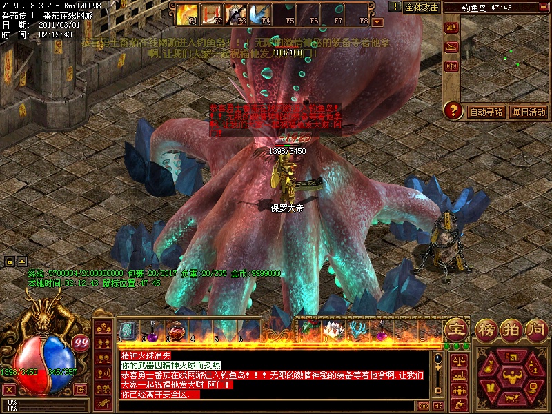 :★新区开区第二天晚上8点激情沙战.奖励为:200W元宝,全国奖励最高服(攻城结束后沙皇宫里面的雕像自己领取)