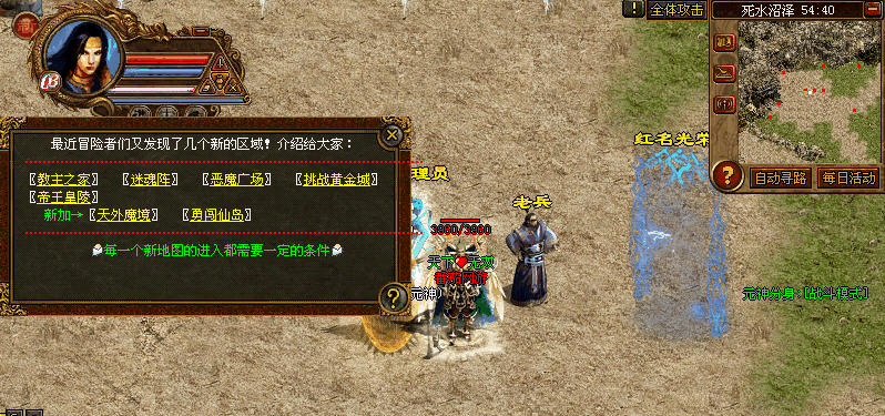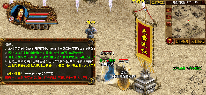 ★新加最新地图【勇闯仙岛】.里面分5个岛屿.可以自己刷出怪物来打装备!这些怪物佩带有杀神.杀佛.藐视套装.杀死后直接从身上爆出!行会盾牌里面好爆!!从老兵--勇闯仙岛--进入!