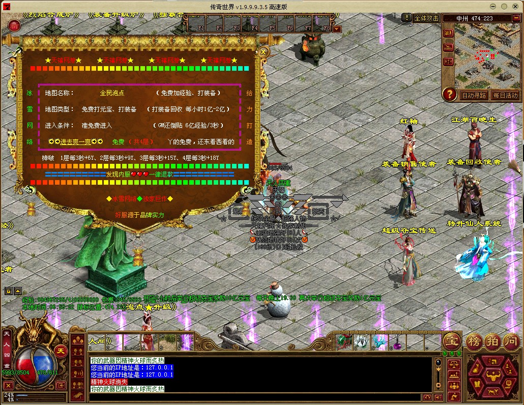 2,打宝:高级打宝(15分钟刷新小boss),帝王圣地(30分钟刷新boss)五大升级地图(30分钟刷新boss),可爆出天人晶核,大量元宝,积分,高级装备,高级物品。终极boss为千年帝王,玉皇大帝分别在帝王圣地2层,高级打宝刷出。可爆本服所有装备。