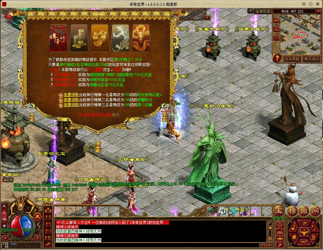 武林大赛,每天3次,获胜者奖励1.8888亿元宝,高级装备一件,积分200点。