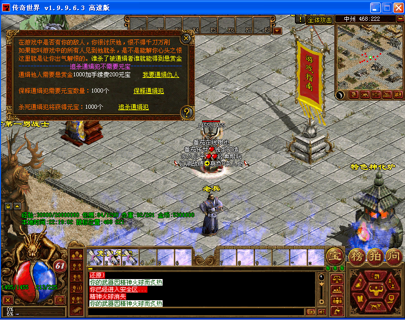全国独家通缉系统:可以把游戏中的任意玩家抓入通缉房.杀掉被通缉的人可以得悬赏奖金!
