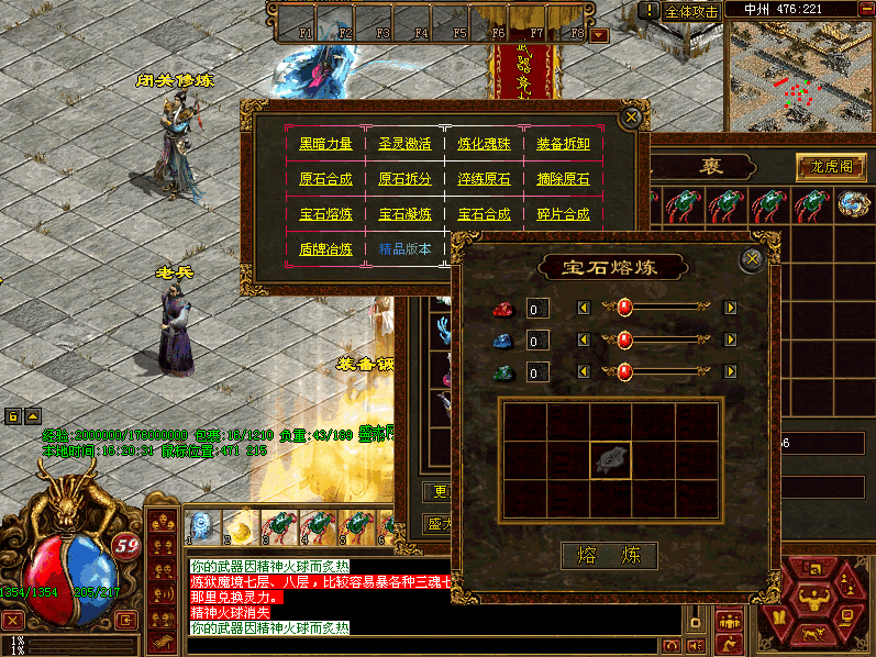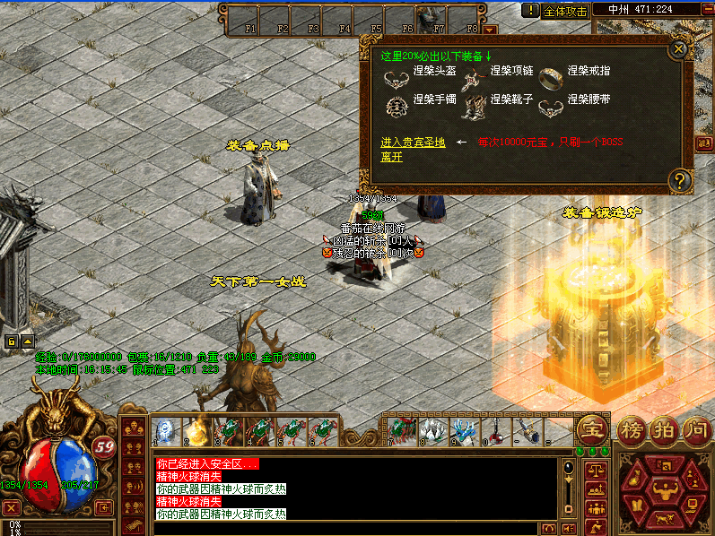 中级玩家在新手打宝区5层打到蟠龙装备后,可直接去天界打圣王精魄融合为圣天上品,不要急着带,用一块精炼石就可以转换为炙炎装备