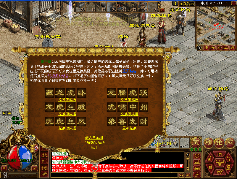 黄金寻宝:活动开始进入黄金城地图,杀死携带字体的老虎收集字体,即可兑换圣天装备