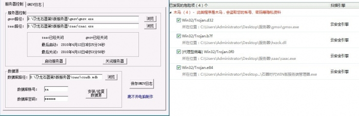 解决办法:请出现这个问题的各位,把服务端中的LONGZORO.DLL和sa_8001.exe 在杀毒软件中设置信任(应该只是加了壳,所以才报毒),并且用管理员身份运行:石器时代WIN版服务端管理器.exe (非常谢谢 ymj216 提供解决办法)