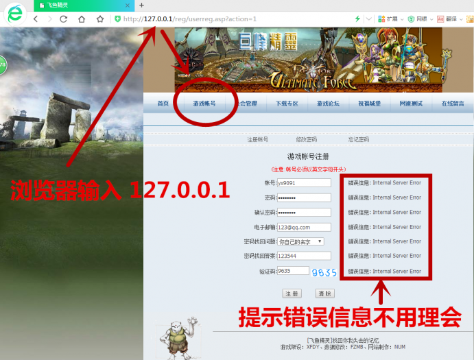 帐号注册方式,打开网页访问http://127.0.0.1/即可进入游戏主页,进入游戏帐号页面注册帐号。