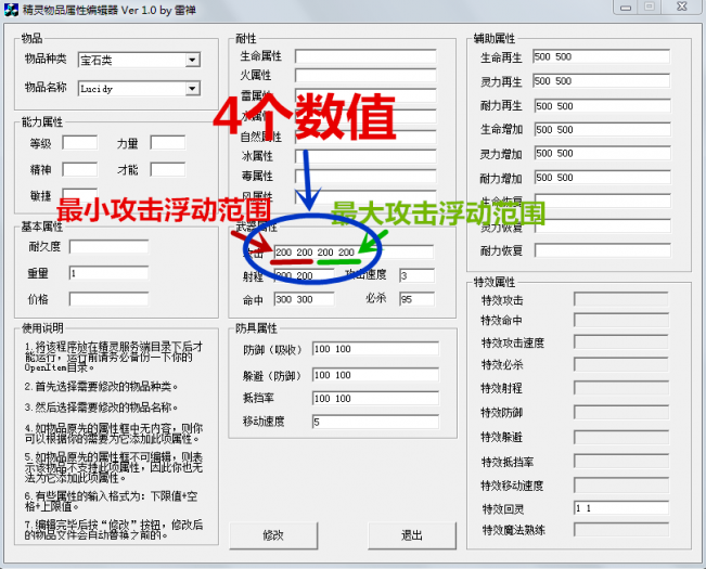 重点:修改所有东西记得全身的装备攻击属性累积不能超过1000点,否则会清零。