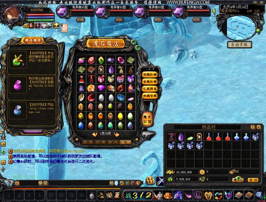 1、完美仿官方,最高三宠 ,装备最高+12,战魂+8,等级最高137级