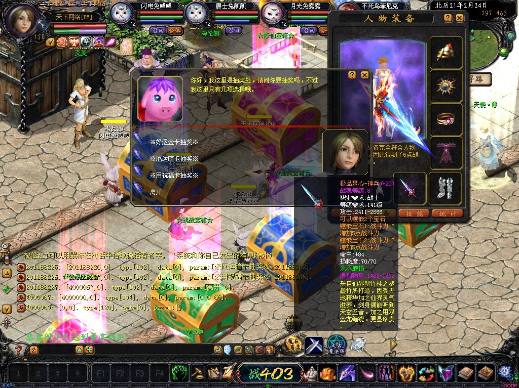 ⑼:抽奖,使用好运金卡--厄运暗卡-抽奖 即有机会抽取100万-1亿的魔石大奖,祝福卡抽-500万-2亿魔石,,非RMB玩家照样牛