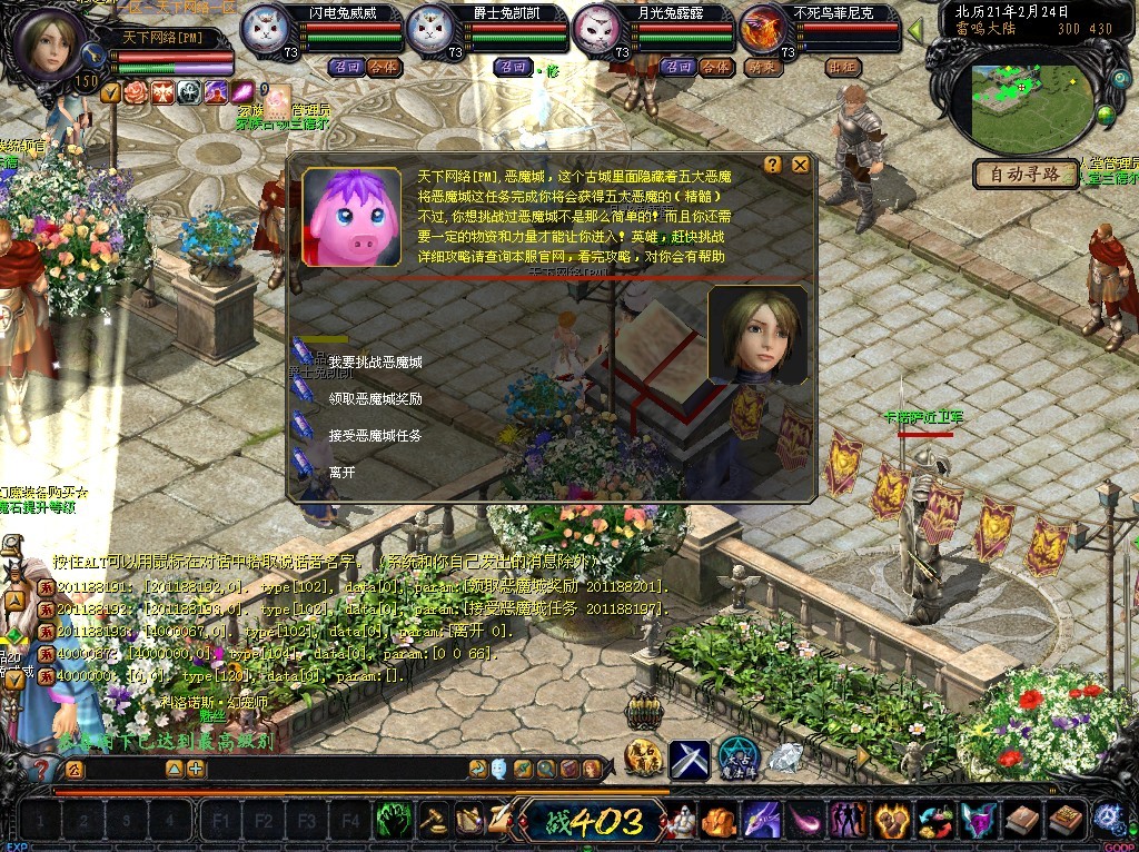 1:挑战恶魔城需要【炼魔徽章】而且必须是队长!可以组队友带队友进去 并肩作战!在恶魔传送猪接受任务,会自动寻路到任务开始的地方,然后做2分钟左右的任务,将任务做完会自动寻路回来恶魔城NPC[注意:一定要把任务做了进恶魔城会刷怪]