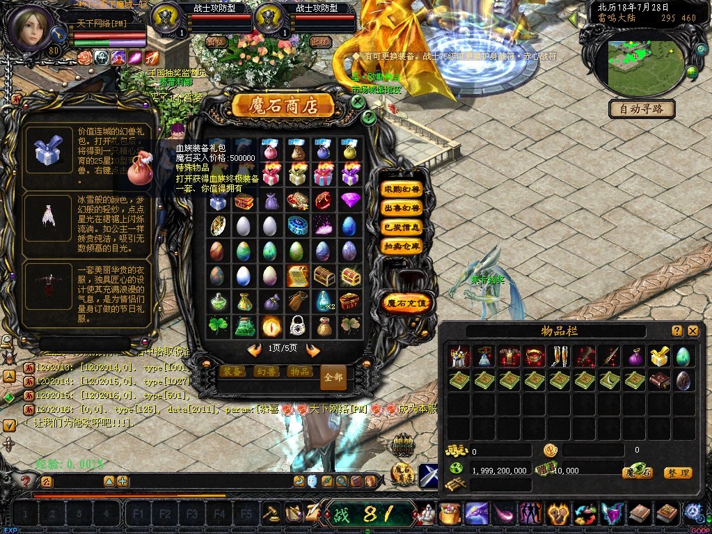 魔石商店出售 所有职业装备礼包 打开全是 +12双洞 战魂+8的装备 血族的也有哦!