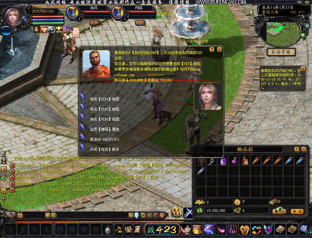 领工资,远程幻化宠物,BOSS传送,城市传送,洗去红名,出售最新7种加255神器等... ... 所有的功能分