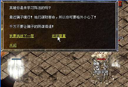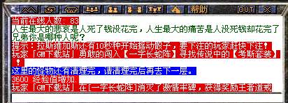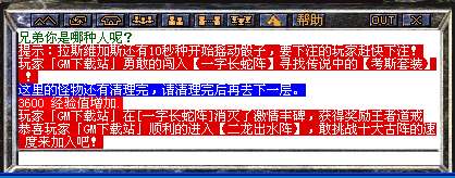 由于是我们刚写出来,很多GM朋友都不知道是个什么类型的脚本吧,我现在给大家介绍一下,这个脚本也是个让玩家烧钱的好东西哈,【十面埋伏阵】一看就知道应该有十层是吧,每层里面有2个NPC(这2个NPC是每时每刻都在这个地图随机传送的,玩家没有规律可以寻找,就算运气好的闯过10关的玩家下次来挑战也是没有任何经验的);其中一个是真的会把玩家传送到下一层去挑战,运气好的玩家闯过10关之后就可以获得由你设置的奖励物品或元宝(这个大家可以根据自己的需要进行修改);而另外一个则会把玩家传送到另外一个我们设置好的地图,被传送到这个地图的玩家只能通过给设置在这个地图的NPC元宝或者是金币才可以传送回城,此地图不能使用任何回城物品,就算小退也还是在这个地图。