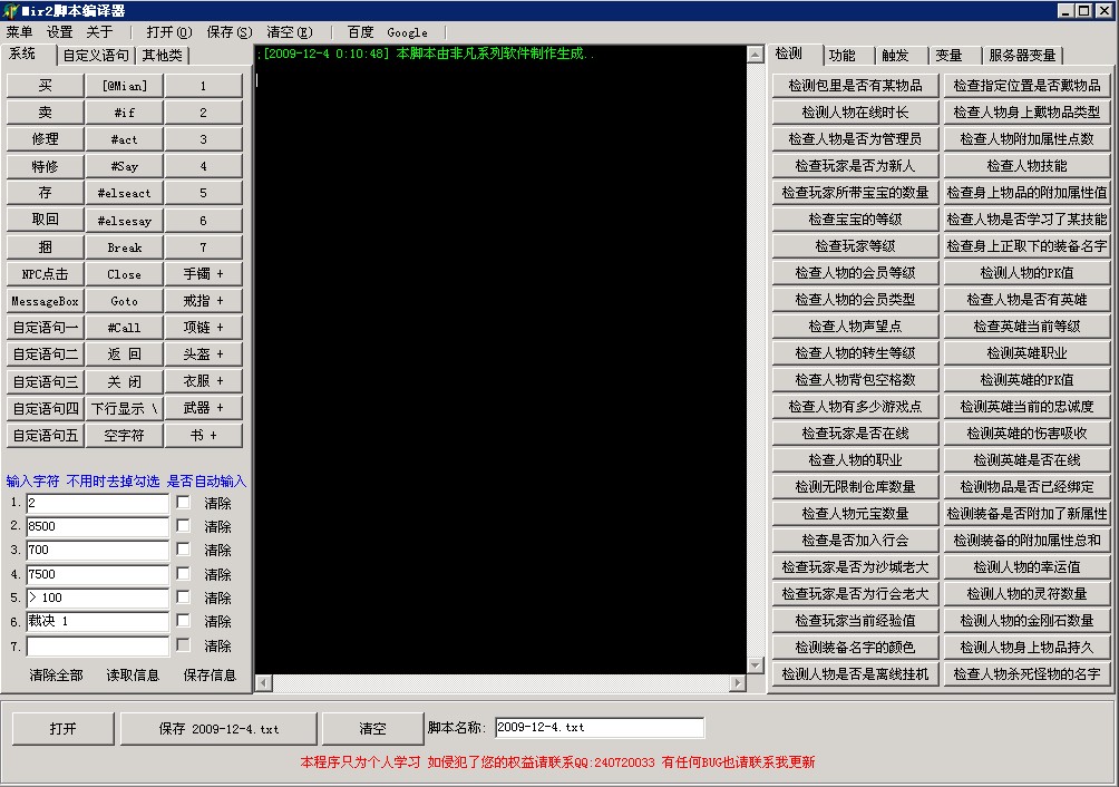 由于检测类和功能类命令很多工作量很大,请求大家帮助我完善此2类,本程序目前只支持HERO脚本,其他引擎更新添加。