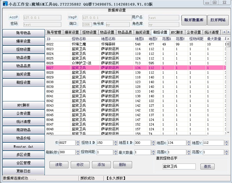 16:2011年7月13日更新“刷怪设置”添加功能.修改无法删除数据功能