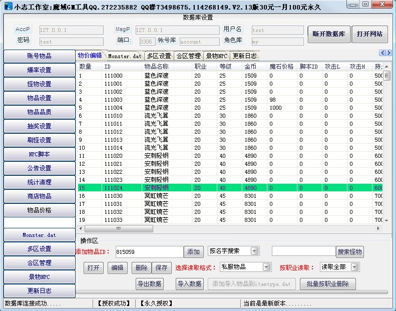 32:2011年7月27日添加““物品价格”添加导入物品到itemtype.dat文件,可以直接同步到数据库里,未授权版本无法添加到数据库,此功能大大提升添加装备简介化一键OK
