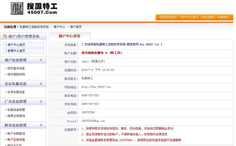 在次声明:以上功能全部开放使用,没有做任何限制,也没有任何限制收费使用,请大家放心使用,你在使用本程序的过程中,我们将终身为你免费提供更新,我们发布新版本在你的后台官方版本号会有所改变,如果你正使用的版本号和官方版本号不同,那么就需要更新,请登陆到我们的网站,www.45007.com 下载更新程序,以及更新日志.