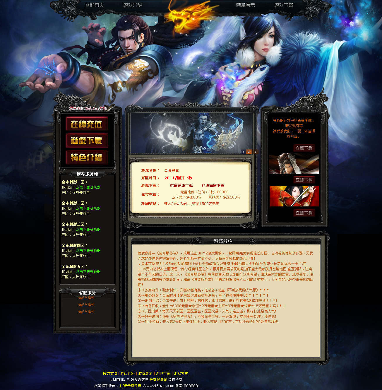 **目前市面上大部分免费模板都有加水印或是程序有残缺,我们都知道作为传奇私服的门面,拥有一套大方简洁绚丽的开区网站是很有必要的。