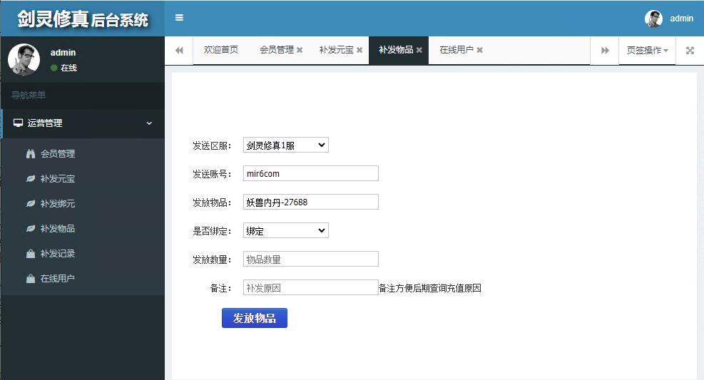 登录自动注册账号,游戏已可以正常进入了,我们先看看游戏演示。好了,我们看看后台。