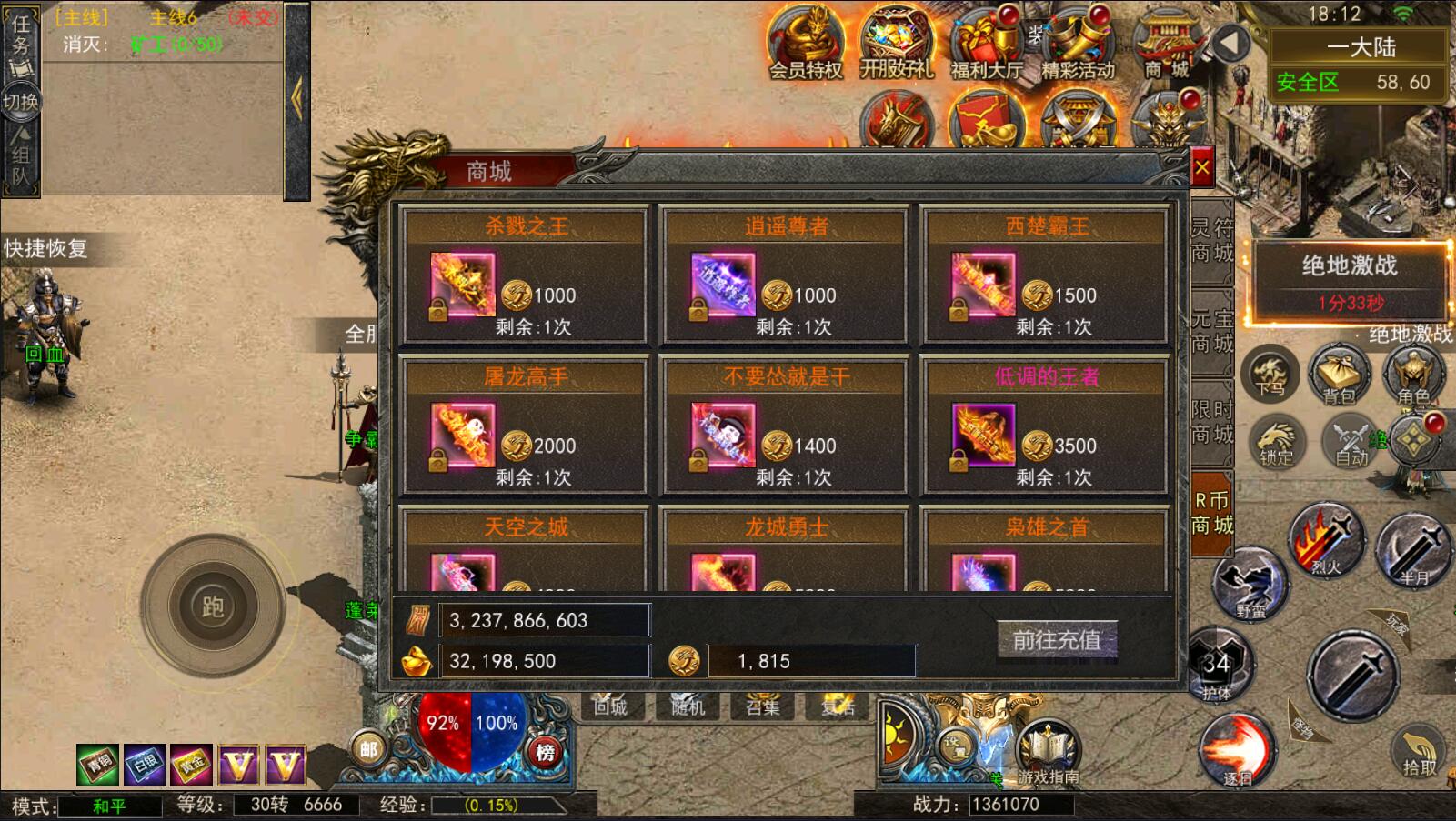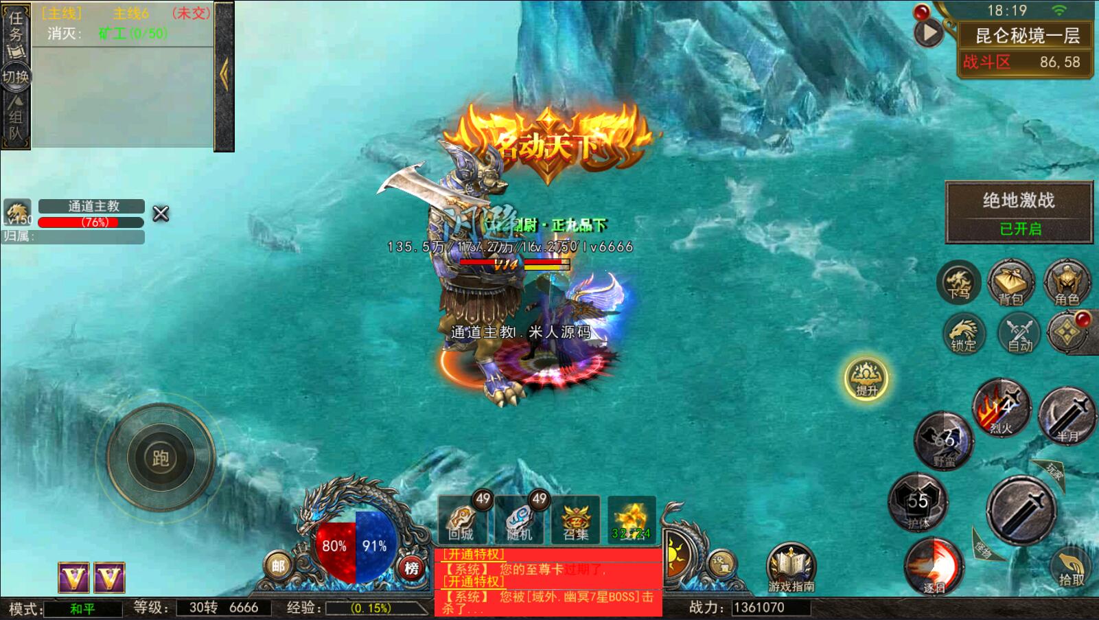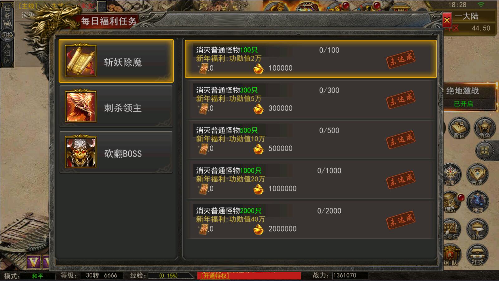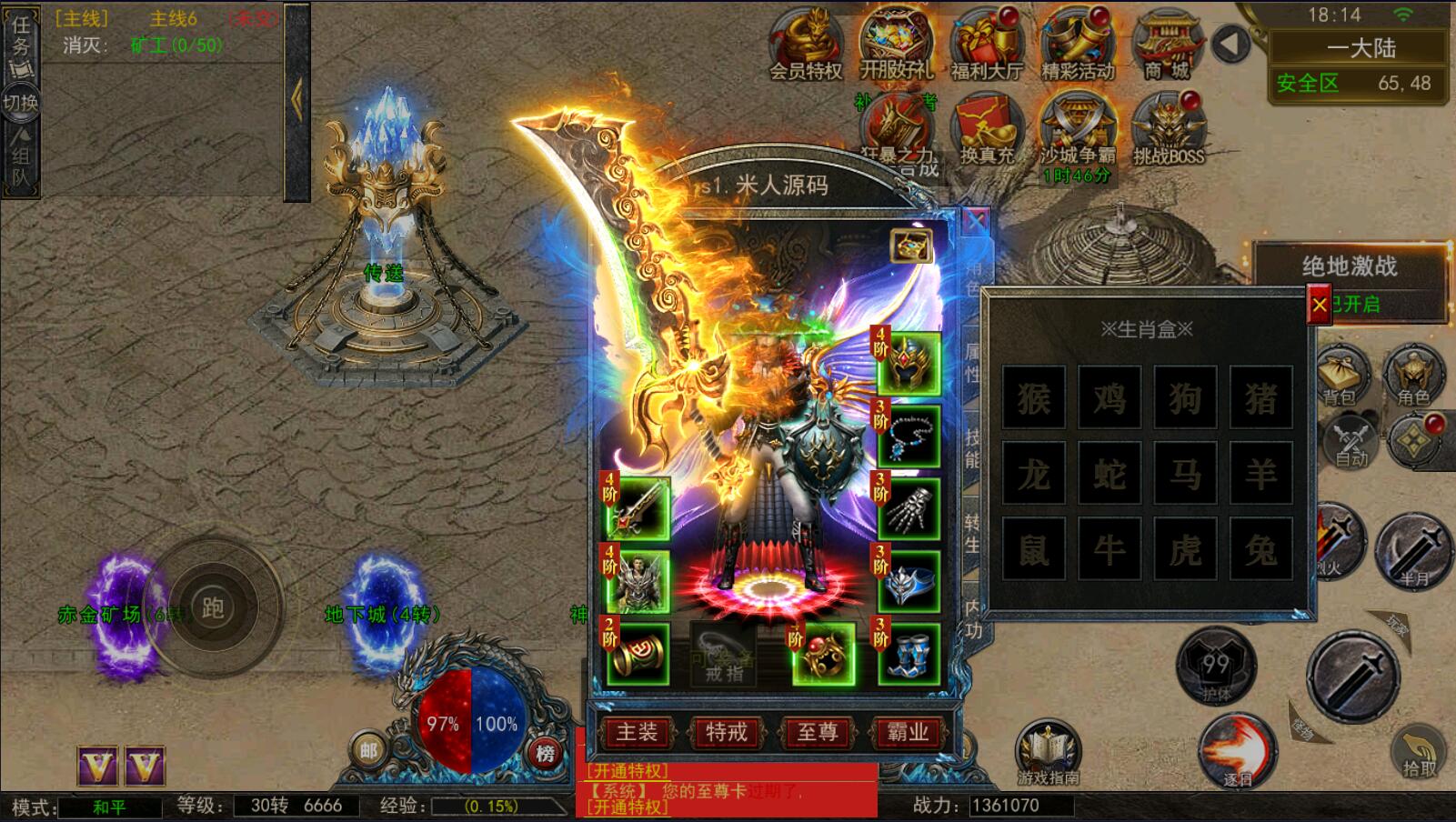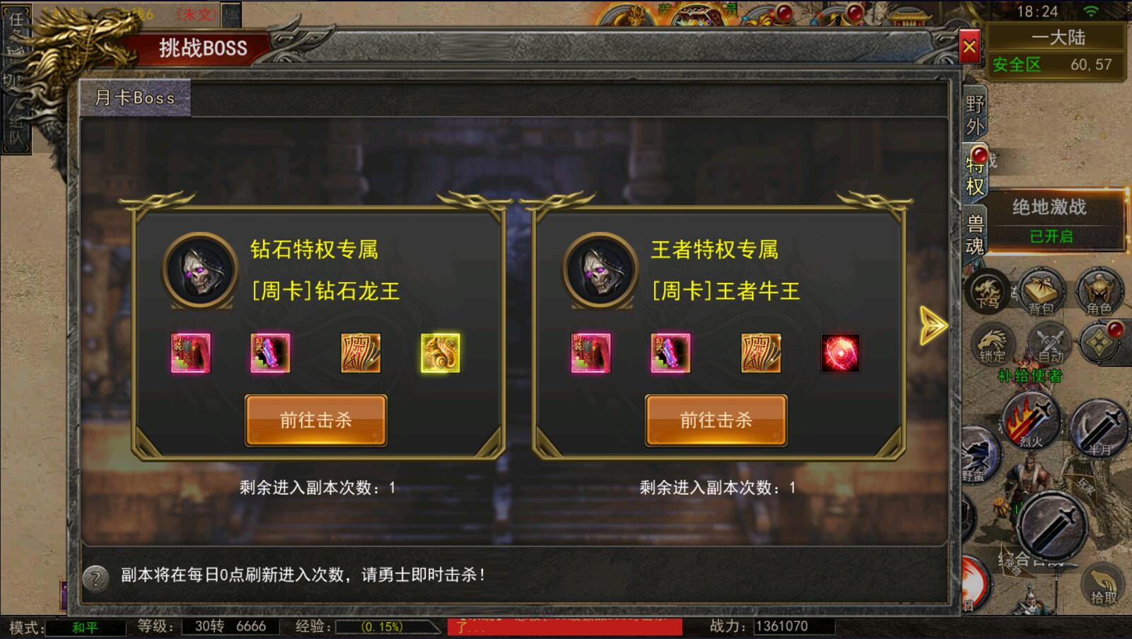 5.等级达到1000级可以打[野外BOSS]了爆率搞还掉珍惜道具和灵符.