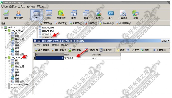 然后打开Navicat for MySQL,打开au_server_ls找到gameservers这个表。然后。把其中的mask这个表值中的127.0.0.1改成