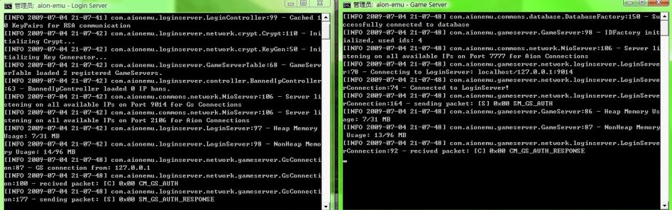 注意:需要自己安装mysql数据库,并生成ae_server_ls和ae_server_gs两个数据库,将上面压缩文件中的几个sql文件导入生成数据卡表格,(loginserver中的sql导入ae_server_ls,gameserver中的sql导入ae_server_gs)。。数据库用户名为root,密码为空。(想设的也可以,只要密码和解压完了的文件中的database.properties中的database.password=后面加上即可)熟悉天堂II模拟器的人应该很明白