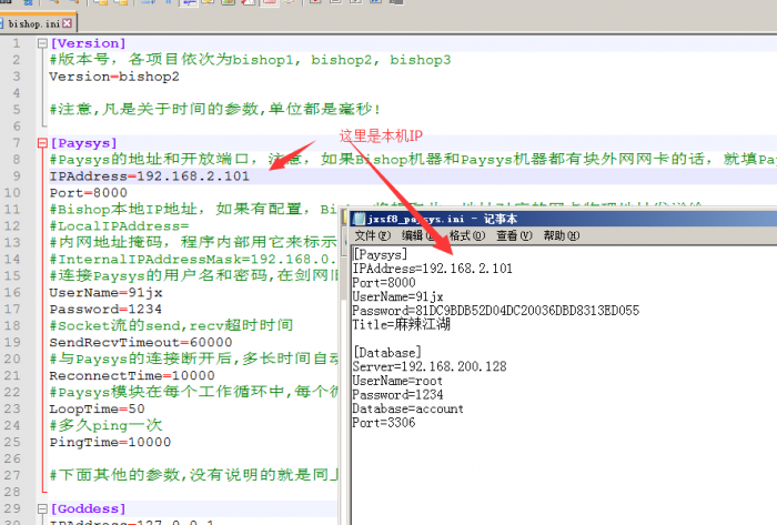 2再来修改pay与Bs的设置 jxsf8_paysys.ini IPAddress=192.168.2.101 Port=8000