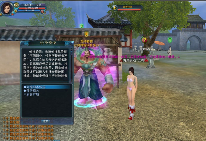3.封神轮回:河阳封神特使处接任务(不同职业,性别所接任务不同),任务要求击杀相应任务怪(怪物强悍,建议凑齐封神中级装备后再去完成,任务不限时,不可放弃,不可组队)。完成任务后将获得专用附加属性称号(拥有称号后才可佩带封神装备,以及进入封神专用地图:神域---神域小怪爆封神装备材料,神域七大BOSS掉大量材料,高级铁玉,真完壁符等。)