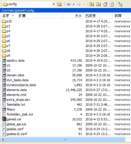 启动Winscp,登入,先点返回上一目录,usr/rain/gamed/config里往下移,一开始的全是地图文件夹,移到下面,把elementdata.rar解压的elements.data和gshop.data这2个文件放进去覆盖