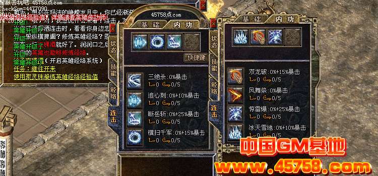 首先人物和英雄上线自动练成内功和连击。
